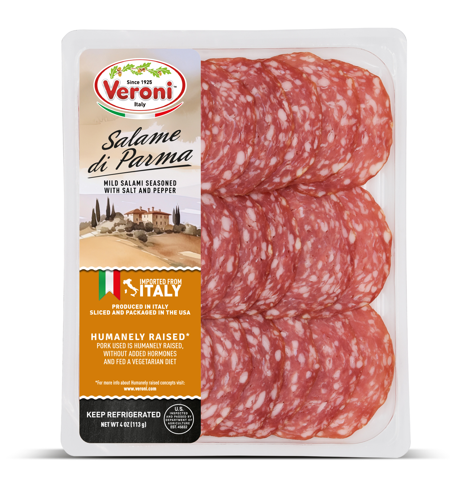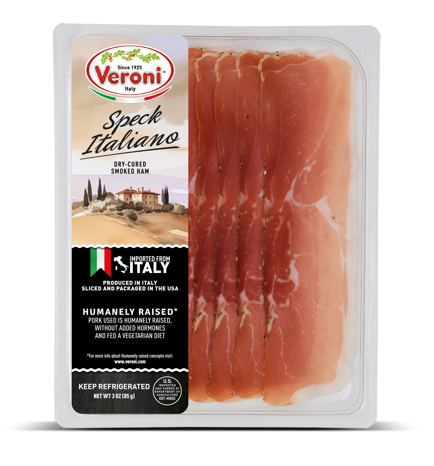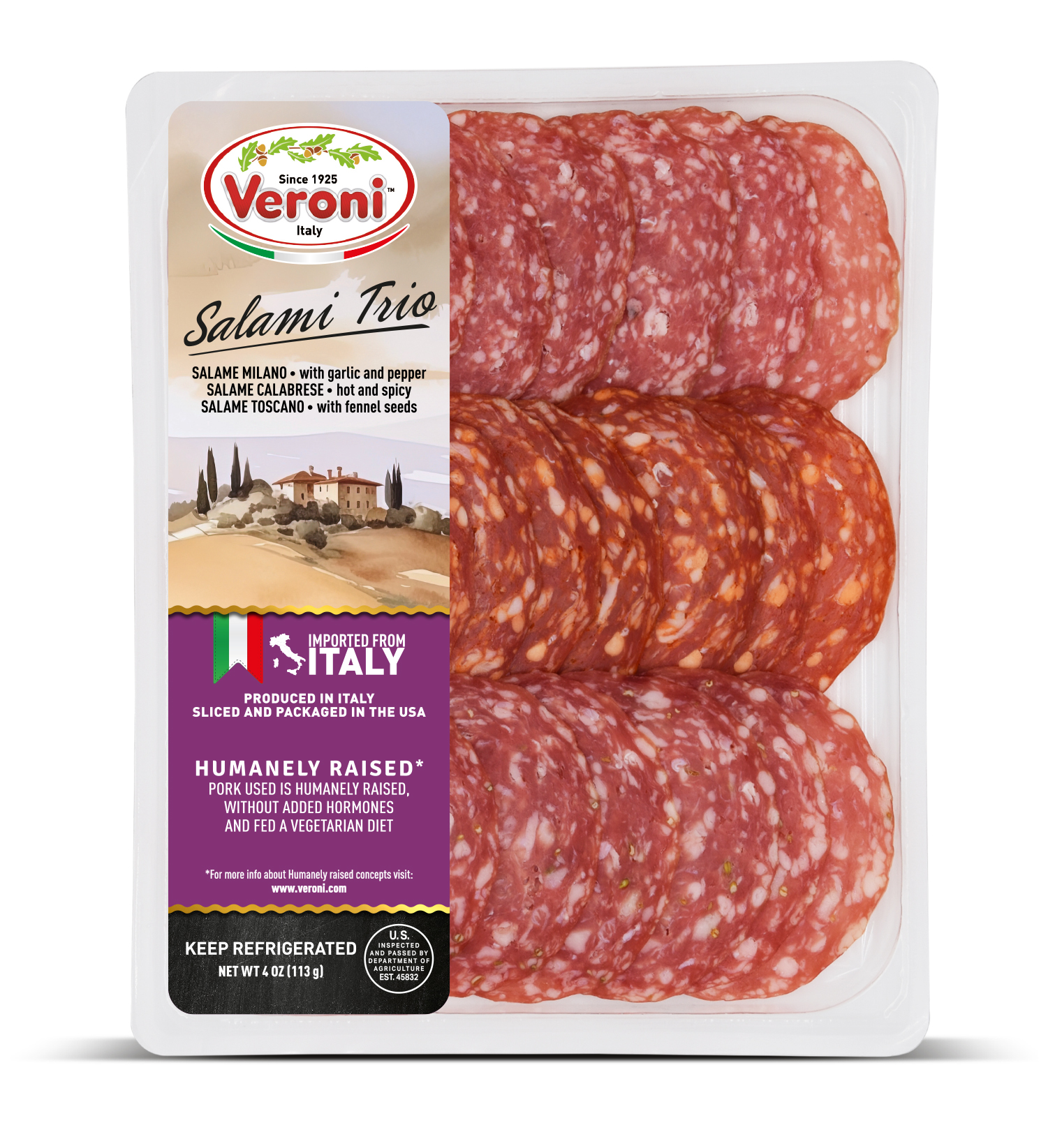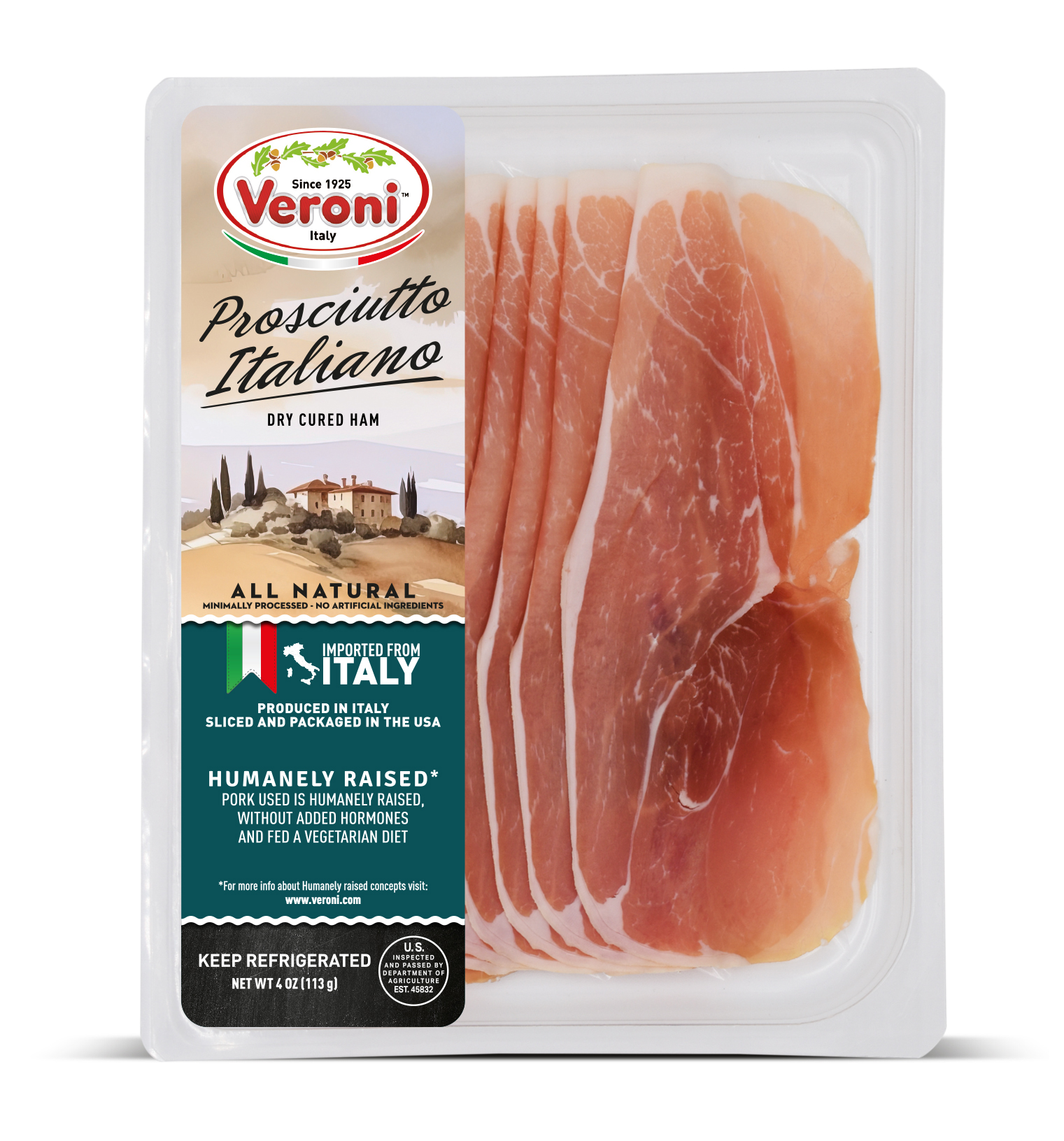 The entire product assortment is manufactured and HPP processed in Italy. It is then sliced and packaged in a consistent climate-controlled environment in Veroni’s USA facility, to guarantee optimal freshness. The slices are cut very thinly, as if they were prepared in Italy, for the best taste and aroma. We then apply “Ready to Eat and Easy to Open” packaging, a new type of easy open packaging, which results in a longer shelf life.