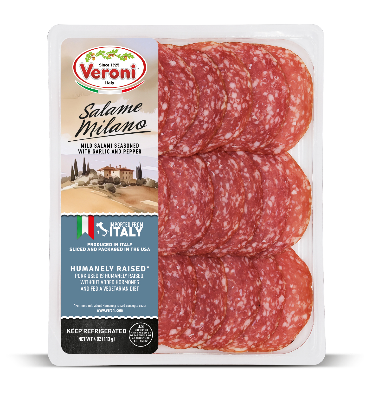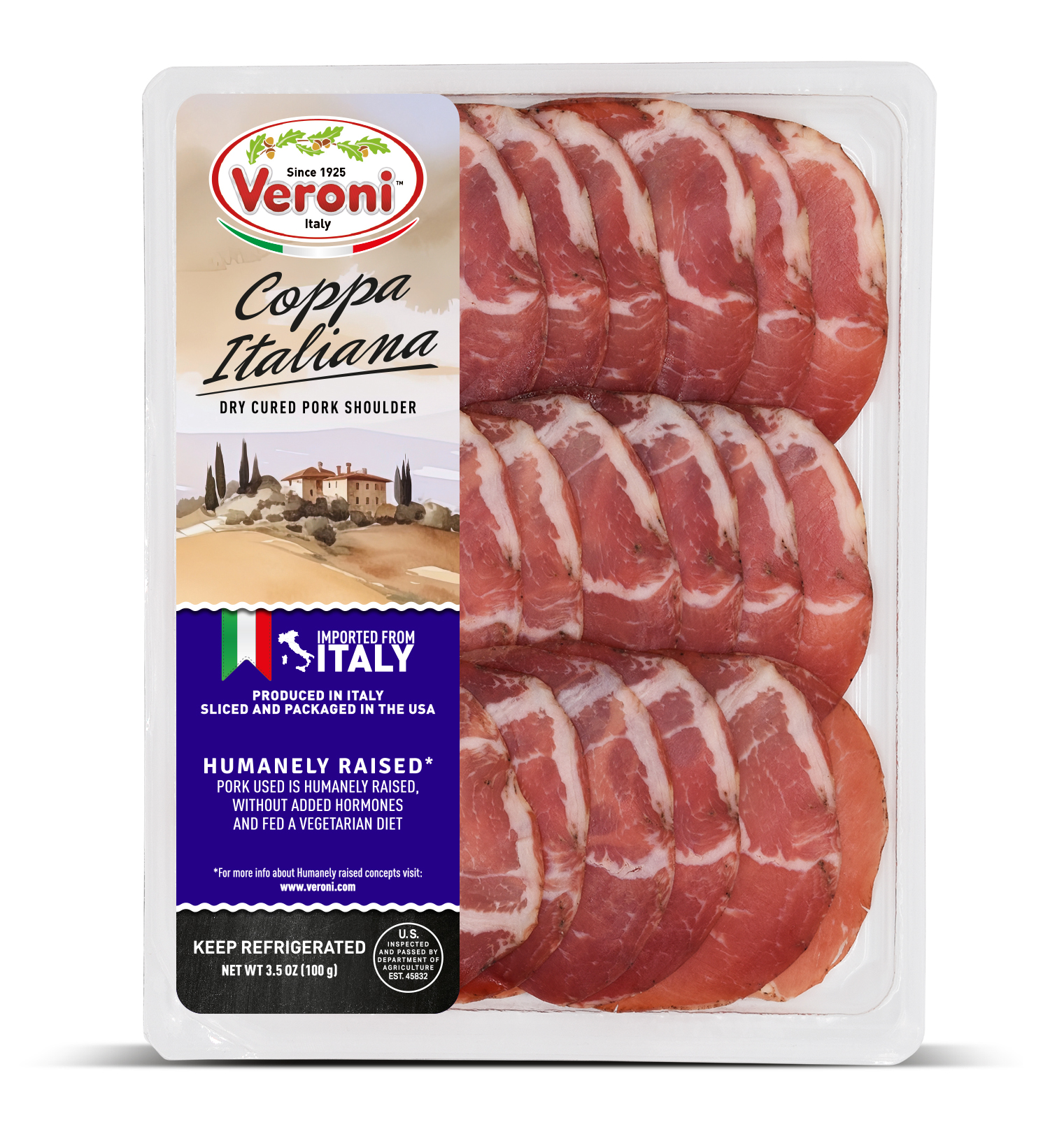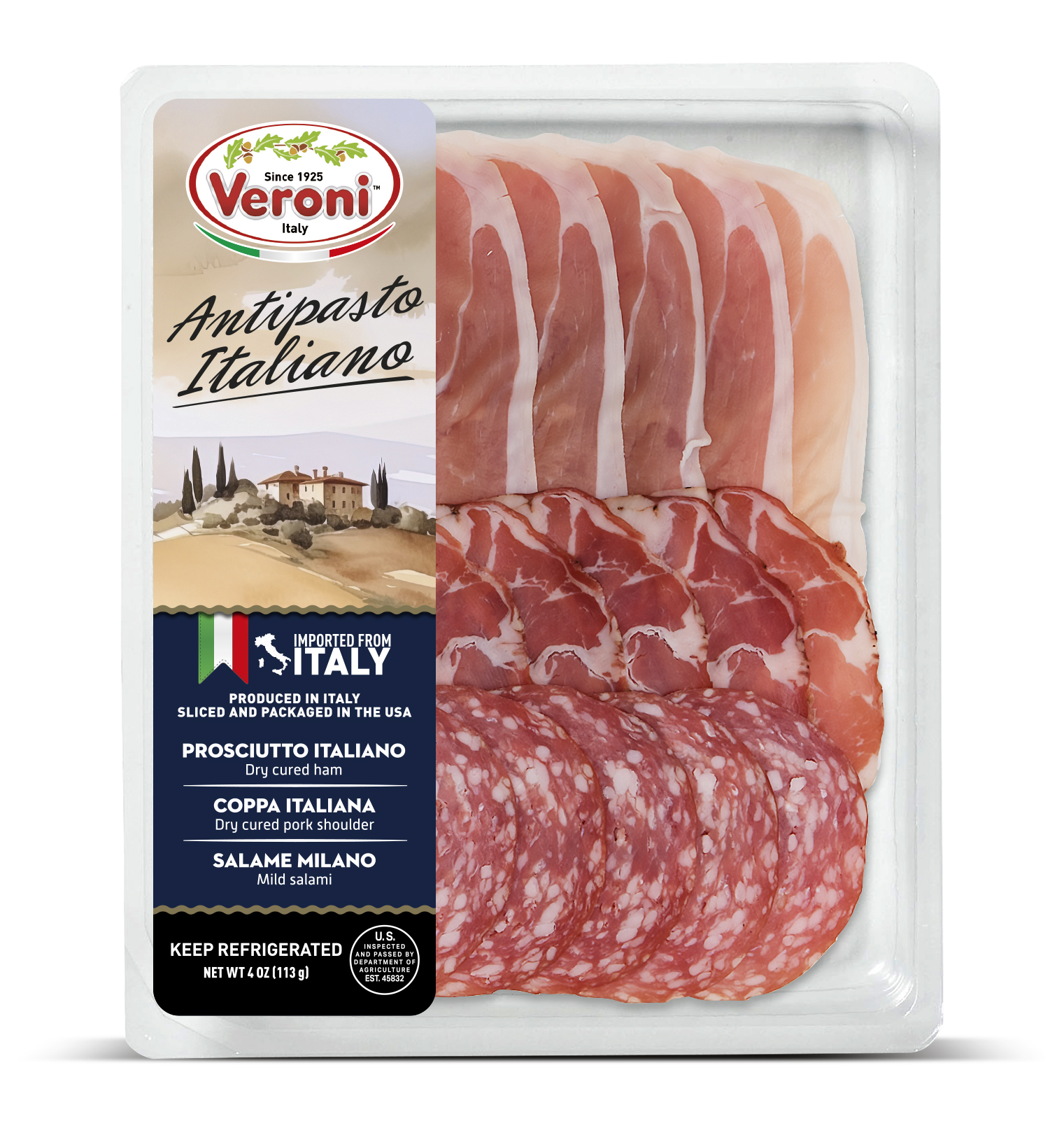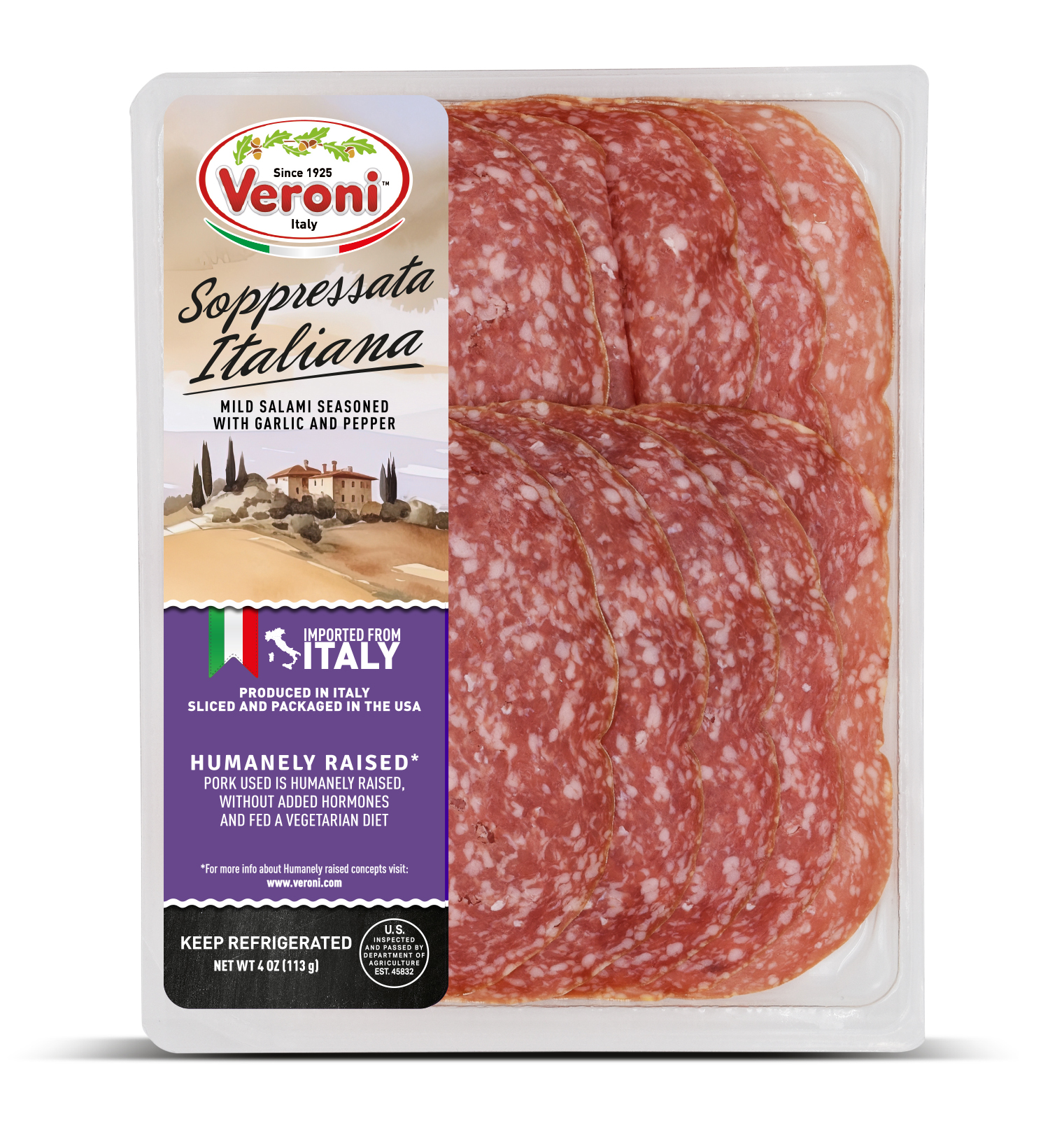 The entire product assortment is manufactured and HPP processed in Italy. It is then sliced and packaged in a consistent climate-controlled environment in Veroni’s USA facility, to guarantee optimal freshness. The slices are cut very thinly, as if they were prepared in Italy, for the best taste and aroma. We then apply “Ready to Eat and Easy to Open” packaging, a new type of easy open packaging, which results in a longer shelf life.